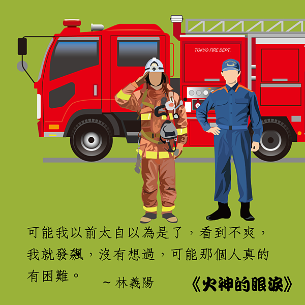 『火神的眼淚』劇中分隊正義魔人羚羊時常為隊員的超重工作抱不平,每天處理的要事一籮筐,還得承接酒鬼、刁民的案子,根本不堪負荷。直到他發現一個「常客」的酒醉行徑,來自公司惡性倒閉,家庭因而破碎,他反省自己看人、做事不能只從表面觀察,每個人都有自己的苦衷,都值得多給一份體諒、溫暖。